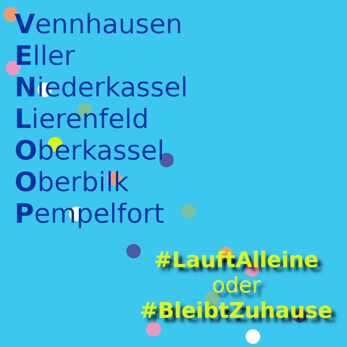Daher möchte die run.dus.crew dieses Jahr einladen zuhause in Düsseldorf zu bleiben: Unsere erste Idee war es gemeinsam durch die Stadtteile V_ennhausen, E_ller, N_iederkassel, L_ierenfeld, O_berkassel, O_berbilk und P_empelfort zu laufen. Das wollen wir wegen dem notwenigen Social Distancing jetzt aber natürlich auch nicht.